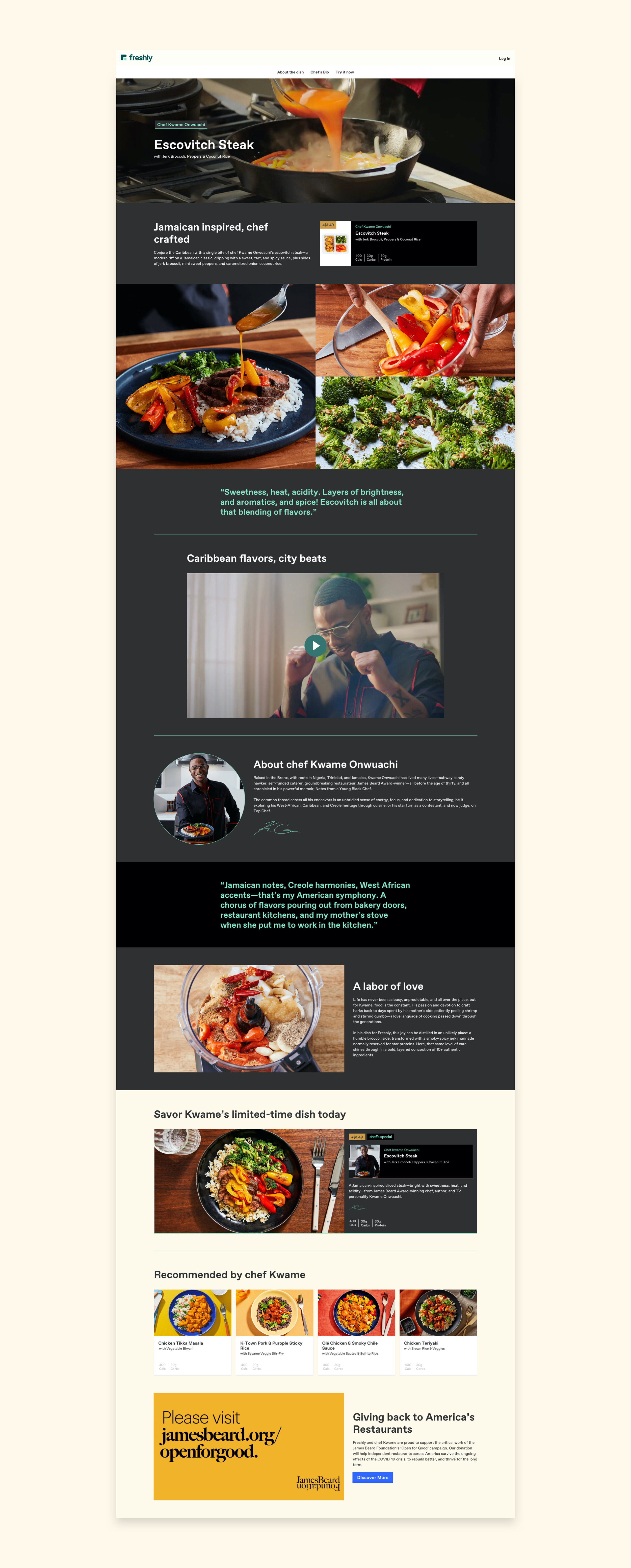 Concept, copy, and scriptwriting for “Chef’s Special”—Freshly’s year-long series of culinary collaborations with James Beard Award-winning chefs Sean Brock & Kwame Onwuachi, Top Chef winner Kristen Kish, and Food Network star Jet Tila.